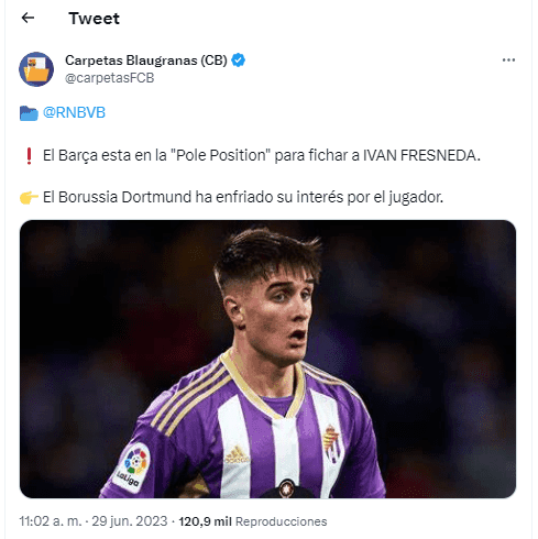 De acuerdo a la información del medio alemán RNBVB, FC Barcelona pica en punta para poder fichar al español Iván Fresneda. El defensor, que también es seguido de cerca por Borussia Dortmund, es uno de los deseos del conjunto culé para poder darle una variante más a la zona defensiva del equipo.