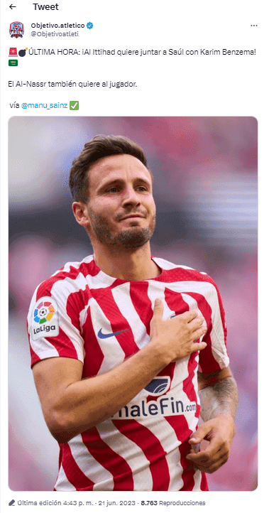 De acuerdo a la información del periodista Manu Saiz de diario AS, Saúl Iñiguez tiene un fuerte ofrecimiento de Al Ittihad, que se suma a la propuesta de Al Nassr, el elenco de Cristiano Ronaldo. En caso de aceptarlo, el actual volante de Atlético de Madrid sería compañero de atacante francés y no de CR7.