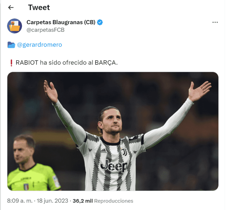 Recuerdo la información del periodista Gerard Romero, el volante francés Adrien Rabbiot fue ofrecido a FC Barcelona. El mediocampista vence su contrato con Juventus de Italia y se hará del pase en su poder, un dato no menor a tener en cuenta debido a las complicaciones financieras que atraviesa el conjunto Culé.