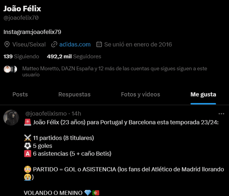Todo empezó con un tuit de la cuenta @joaofelixismo, una cuenta que lógicamente banca al jugador que siempre soñó con jugar en el FC Barcelona y que ahora vive un gran presente deportivo, lejos de los escándalos y las peleas en el Atlético de Madrid con Diego Simeone. En este contexto, la cuenta fan de Joao Félix publicó un tuit que decía lo siguiente: “João Félix (23 años) para Portugal y Barcelona esta temporada 23/24: 11 partidos (8 titulares), 5 goles, 6 asistencias (5 + caño Betis), PARTIDO = GOL o ASISTENCIA (los fans del Atlético de Madrid llorando), VOLANDO O MENINO”.