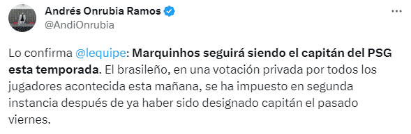 En medio de la jornada matutina se realizó la reunión para la elección del candidato de esta temporada; tras dos intentos realizados se ha impuesto el defensor y lateral brasilero Marquinhos, quien la temporada anterior lució el brazalete en la campaña que les llevó a consagrarse en la Ligue 1. Ahora la misión será ir por la Champions y el referente buscará comandar a su equipo en el campo de juego.