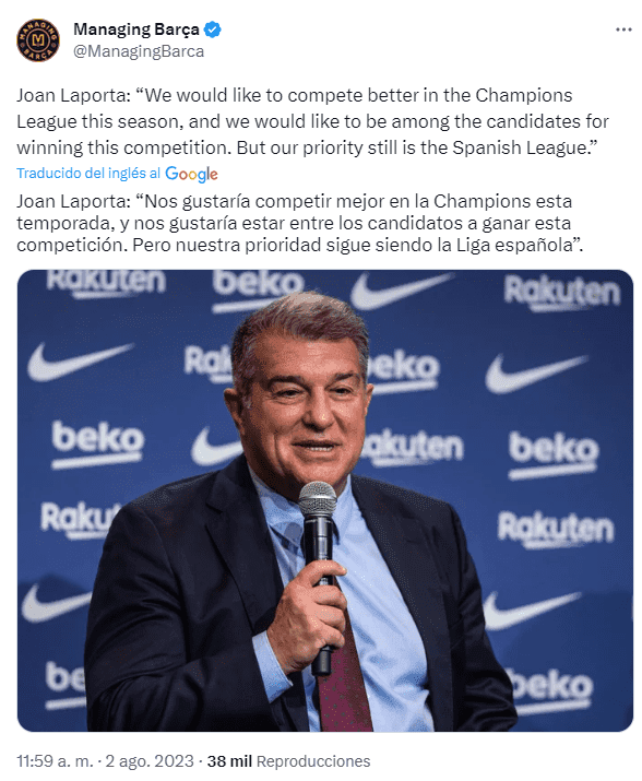 “Nos gustaría competir mejor en la Champions League esta temporada, y nos gustaría estar entre los candidatos a ganar esta competición pero claramente nuestro objetivo es otro", fueron las palabras de Joan Laporta. La afición del club no tomó para nada bien las bajas pretensiones de su presidente, considerando que FC Barcelona siempre tiene que aspirar a ganar el torneo europeo.