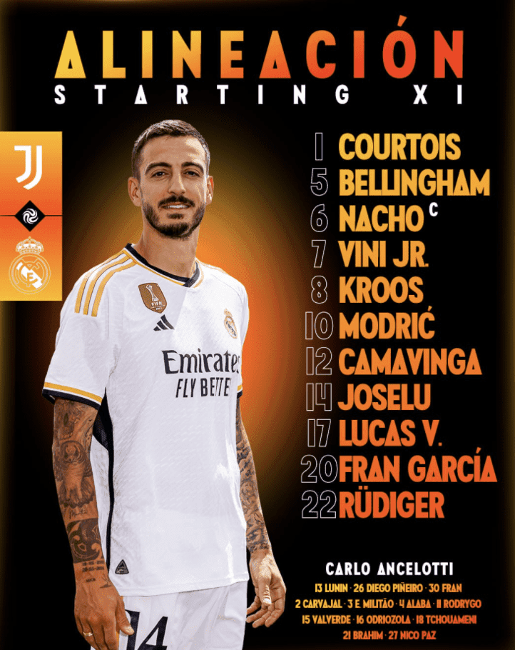 El once confirmado va con: Courtois en el arco; Nacho, Rudiger, Fran García y Lucas Vásquez; en el centro del campo cuenta Ancelotti con Bellingham, Kroos, Modric y Camavinga, para dejar en el ataque a Vinicius Junior con Joselu. La incorporación del delantero ex Espanyol es la gran sorpresa que tiene el DT Merengue.
