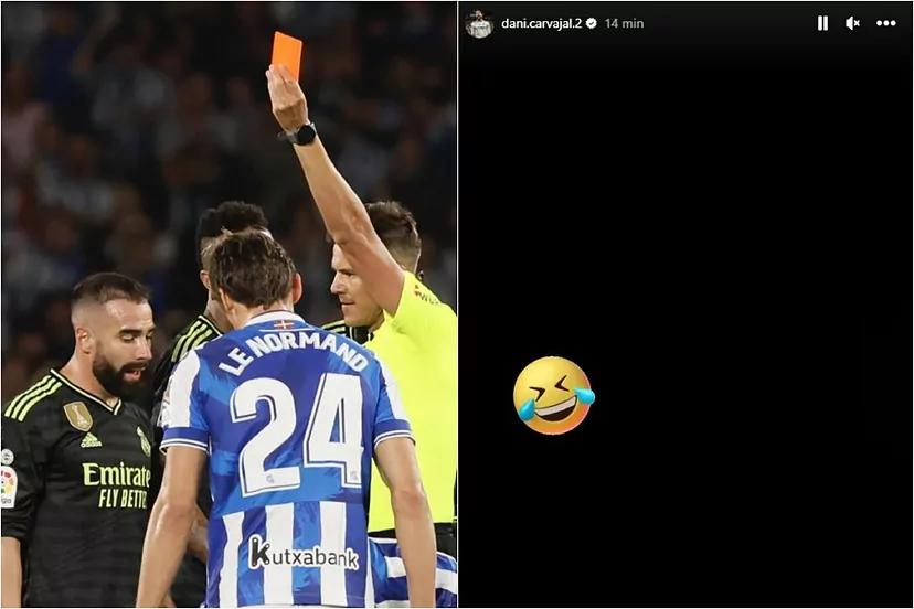 A través de su cuenta de Instagram, Dani Carvajal ha mostrado su descontento tan solo un par de minutos después de abandonar el terreno de juego y con el partido en marcha. Fue algo insólito porque sus compañeros todavía estaban jugando, pero el español agarró su teléfono y publicó una historia con un emoji riéndose, seguramente haciendo referencia a la decisión arbitral.