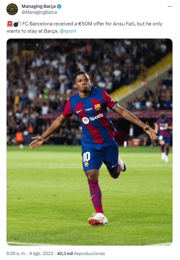 Si bien el monto de la oferta por Ansu Fati es más que tentadora para la tesorería de FC Barcelona que necesita dinero como el agua, el único deseo que tiene el futbolista nacido en la cantera Blaugrana es poder quedarse a pelear un lugar en el primer equipo, algo que ayer empezó a demostrar.