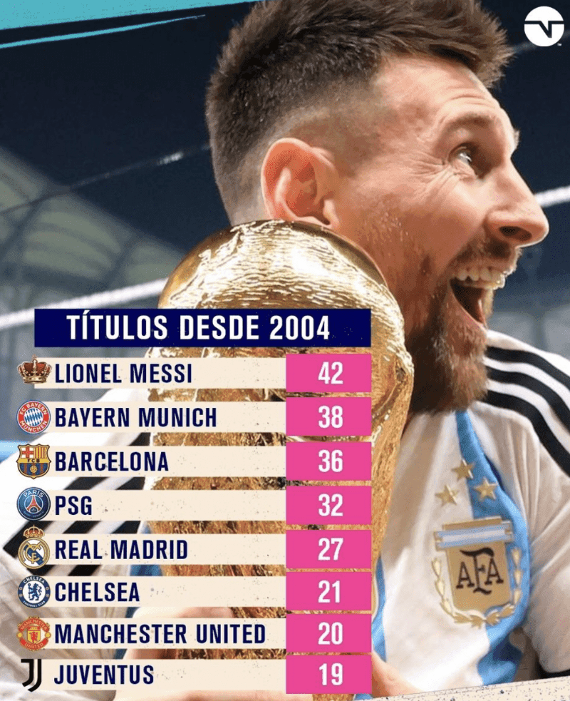 En la lista también están otros clubes importantes en el mundo pero el Real Madrid está en el quinto lugar, solamente superando al Chelsea, Manchester United y Juventus. Lionel Messi, por su parte, desde el 2004 ha logrado ser campeón en distintas competiciones, tanto con los equipos como la selección albiceleste.