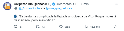 De acuerdo a la información del periodista Adrián Sánchez, el arribo de Vitor Roque se ha enfriado y por ahora está estancado en cuanto a las novedades. Xavi Hernández lo pidió con insistencia pero las noticias de último momento no son para nada alentadoras y el pase en caso de hacerse podría ser para el mercado de fichajes de invierno.