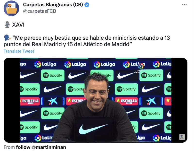 “Me parece muy bestia que se hable de minicrisis estando a 13 puntos del Real Madrid y 15 del Atlético de Madrid”, fueron las palabras de Xavi Hernández luego que le preguntaran si entraron en crisis debido al empate contra Girona. Al entrenador pareció insólito que le critiquen cuando tiene lejos al Madrid y Atleti.