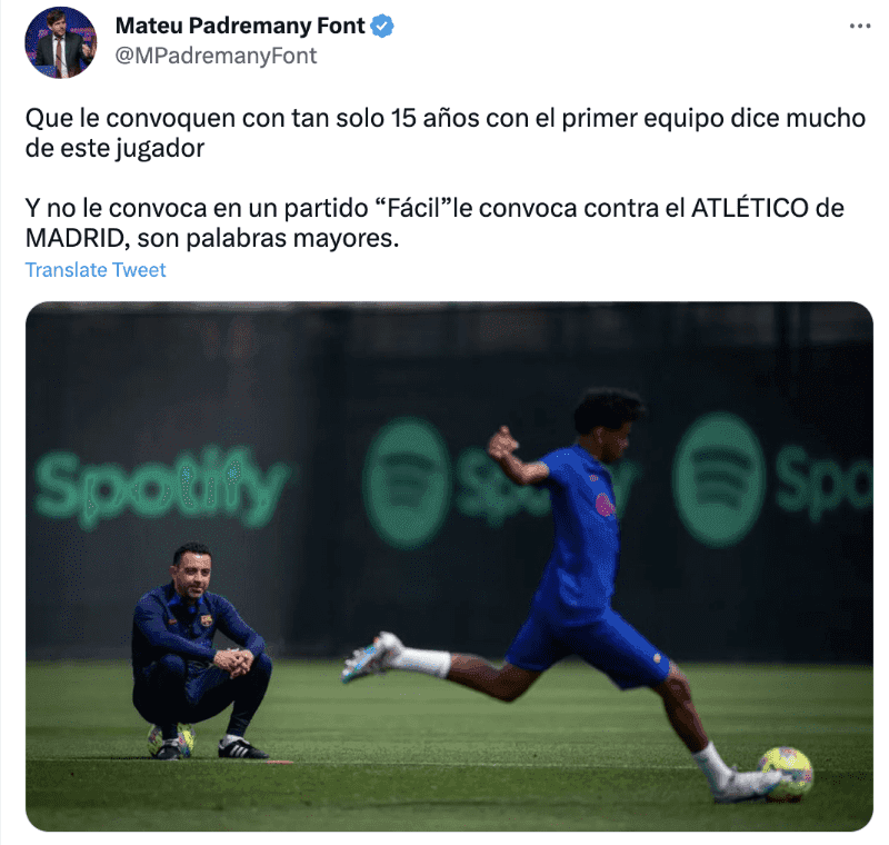 Lamine Yamal ha dejado a propios y extraños sorprendidos con su nivel de juego, incluyendo a Xavi Hernández, quien lo vio entrenar y captaron por una foto su reacción de alegría al ver a un jugador que es muy talentoso. Con tan solo 15 años ya fue llamado al primer equipo y rompió el récord del más joven de estar en una convocatoria.