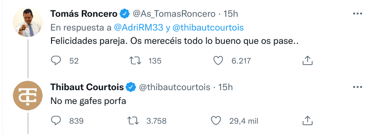 En un posteo de una página que sigue la actualidad del Real Madrid, el periodista felicitó a la feliz pareja. “Felicidades pareja. Os merecéis todo lo bueno que os pase”, expresó el personaje de ‘El Chiringuito’. De inmediato, Courtois sorprendió con una respuesta que se hizo viral: "No me gafes porfa".