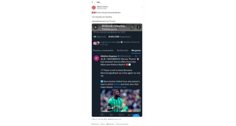 Antonie Griezmann le dio like a una publicación de la cuenta Atlético Express que cuenta que el Colchonero busca a Marcos Thuram, el delantero con presente en Borussia Mönchengladbach de Alemania. El me gusta de la figura rojiblanca no pasó desapercibido en redes sociales y ya encendió la ola de rumores.
