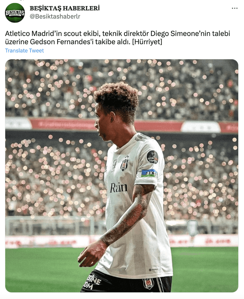 De acuerdo a información de que empezó a circular del portal Hürriyet, Diego Simeone ha pedido a uno de los scouts de Atlético de Madrid que empiece a seguir a Gedson Fernandes, quien actualmente juega en el Besiktas y tiene apenas 24 años. Es el llamado a tomar el puesto en la mitad del campo del Atleti.