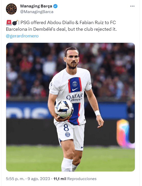 De acuerdo a la información de Gerard Romero, PSG le ofreció FC Barcelona los pases de Abdou Diallo y Fabián Ruiz como parte de la operación. Sin embargo, en FC Barcelona no quieren saber nada y declinaron la propuesta inmediatamente. Así, el futuro de Ousmane Dembélé es una incógnita.