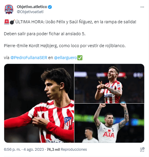 De acuerdo a la información de Pedro Fullana de SER, tanto Joao Félix como Saúl Iñiguez están prontos a ser negociados para poder ir tras los pasos del mediocentro danés que milita en Tottenham. El volante se muere por llegar al colchonero y Diego Simeone lo espera con brazos abiertos.