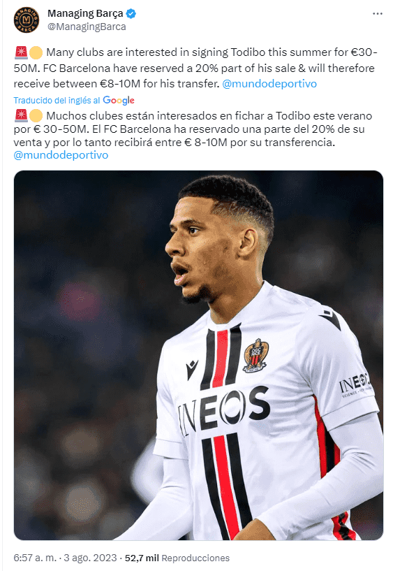 De acuerdo a la información de Mundo Deportivo, muchos clubes están interesados en fichar a Todibo este verano por un número entre 30 a 50 millones. El FC Barcelona tiene reservado una parte del 20% de una futura venta y por lo tanto podría recibir entre 8 y 10 millones por una inminente transferencia.