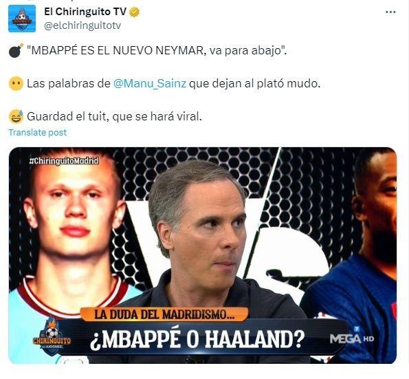 Ahora, en El Chiringuito le han empezado a perder la fe a la llegada de Kylian Mbappé al Real Madrid, por lo que ya no lo tienen como la mega estrella y lo han empezado a menospreciar. Manu Sainz, en el programa, dijo que “Mbappé es el nuevo Neymar y va para abajo”, con lo que le auguran una mala temporada en el PSG, y que ya no sería un gran fichaje para el Madrid.