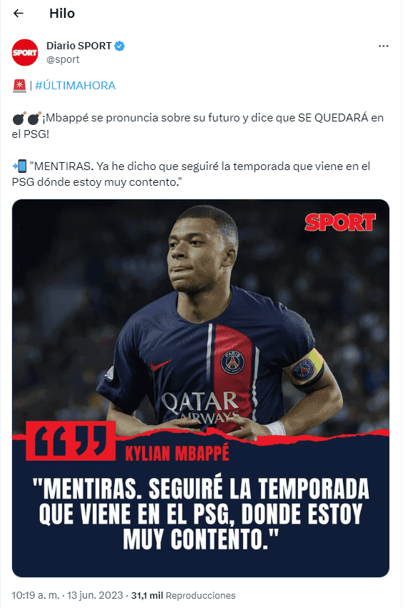 De acuerdo información que refleja Sport, Kylian Mbappé confirmó que el tema de la carta era una verdadera mentira y que su idea es continuar en PSG la próxima temporada, donde se siente muy contento. De esta manera, sepulta la oportunidad de que Real Madrid lo pueda fichar como refuerzo estelar.