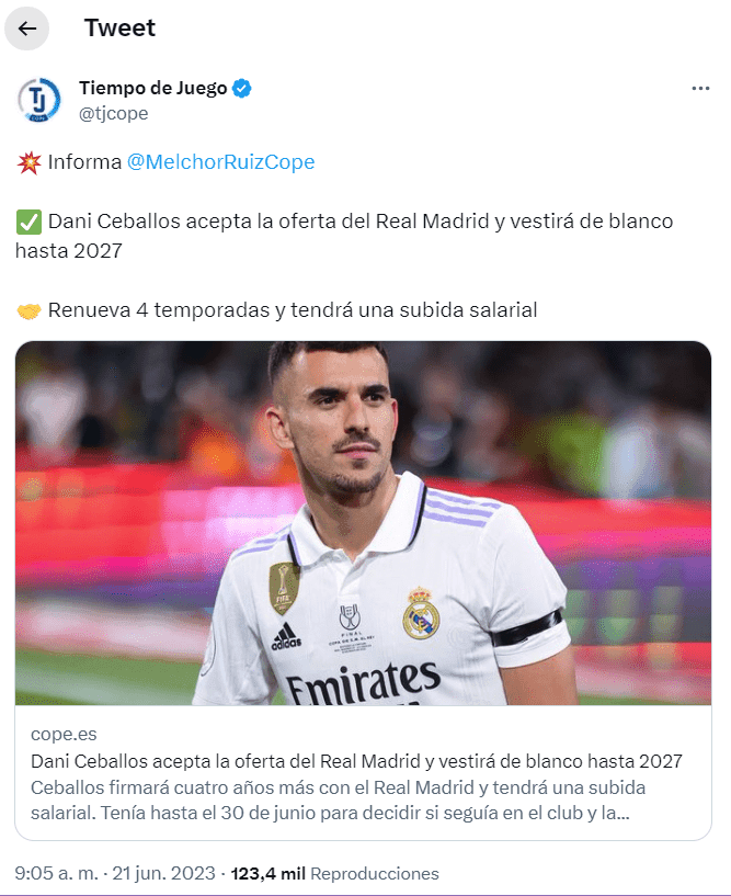 Carlo Ancelotti fue clave para lograr convencerlo y Dani Ceballos lo escuchó atentamente. El volante quiere tener más minutos de los que tuvo en la temporada pasada y eso estaría cumplido. El jugador renovará por cuatro años con un largo contrato hasta 2027, dejando a uno de los favoritos de la afición en el equipo.