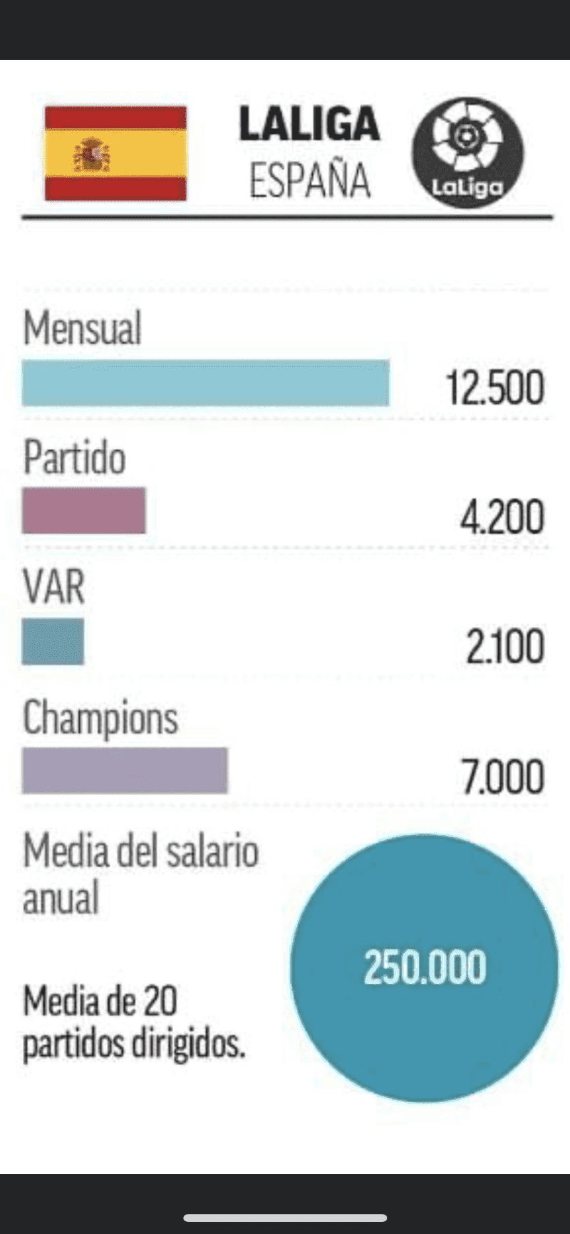 LaLiga sigue el curso y están en la recta final, sin embargo ha llamado la atención cuánto gana los referís. De acuerdo a un informe que salió en redes sociales, mensualmente tienen un salario de 12,500 euros, entre partidos nacionales e internacionales. Siendo un valor alto, incluso a diferencia de otros equipos.