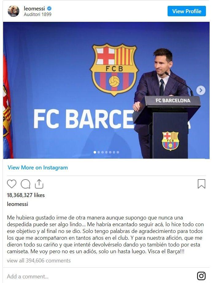 “Me voy pero no es un adiós, solo un hasta luego. Visca el Barça!!!”, cerró un muy emocionado Messi en su cuenta de Instagram. El perfil que suele utilizar para expresarse ante cada situación y que hoy acumula más de 245 millones de seguidores en todo el mundo-