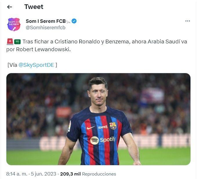 De acuerdo a la información de Sky Sport, en Arabia Saudita quieren concretar la llegada de Robert Lewandowski. Sin embargo, el atacante polaco tiene contrato vigente con FC Barcelona y el Culé pidió 500 millones de euros como resarcimiento para dejarlo partir inminente mercado de pases de verano.
