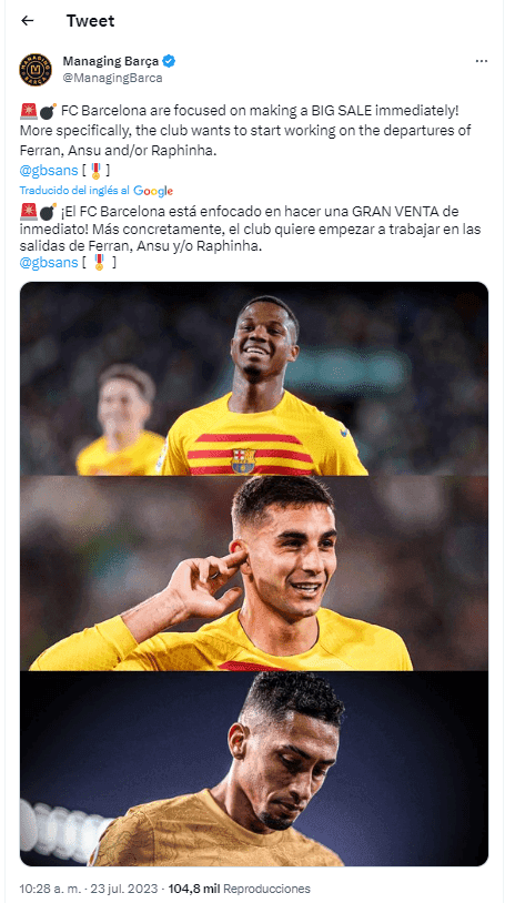 No es solamente Raphinha el jugador que quiere vender FC Barcelona del actual mercado de pases de verano para conseguir dinero fresco. Los españoles Ansu Fati y Ferrán Torres se suman al brasilero, cerrando as,í los tres futbolistas que podrían conformar un paquete que deje varios millones en el club.