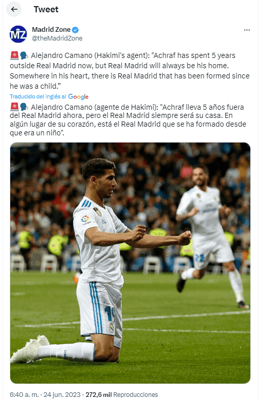 Achraf Hakimi se crió en las entrañas de Real Madrid y en este caso fue su agente el que se encargó de manifestar lo que siente el marroquí por el club: ""Archaf lleva 5 años fuera del Real Madrid ahora, pero el Real Madrid siempre será su casa. En algún lugar de su corazón, está el Real Madrid que se ha formado desde que era un niño", fueron las declaraciones textuales del agente.