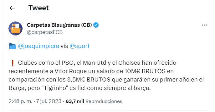 Vitor Roque eligió los colores de FC Barcelona pese a ser un equipo que le pagaba mucho menos que del resto de sus pretendientes. PSG, Manchester United y Chelsea ofrecían 10 millones de euros por año pero el incipiente crack de Brasil terminó eligiendo al conjunto blaugrana por lo que le puede ofrecer como vidriera en lo deportivo.