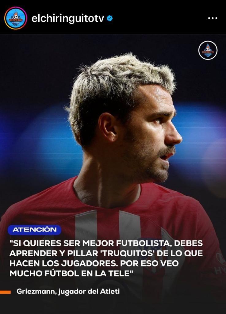 Antoine Griezmann dijo de forma contundente: “Si quieres ser mejor futbolista, debes aprender y pillar truquitos de lo que hacen los jugadores. Por eso veo mucho fútbol en la tele”. Es así que el delantero francés del Atlético de Madrid tiene en cuenta mirar partidos y estar siempre pendiente de quiénes juegan para ganarles.