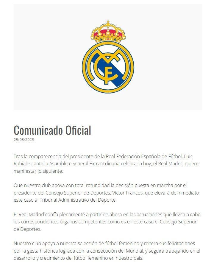 “Nuestro club apoya a nuestra selección de fútbol femenino y reitera sus felicitaciones por la gesta histórica lograda con la consecución del Mundial, y seguirá trabajando en el desarrollo y crecimiento del fútbol femenino en nuestro país.”, sentenciaron desde la institución merengue. Claramente, están a favor de la dimisión de Rubiales.
