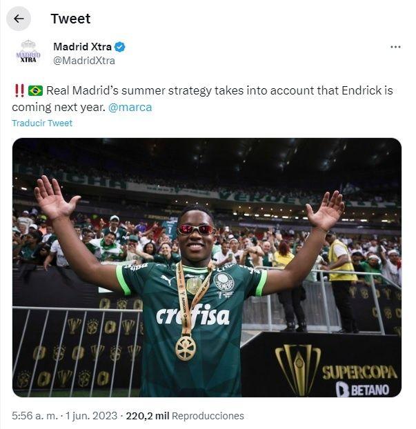 De acuerdo a la información de Marca, en Real Madrid preparan la estrategia que deje el terreno listo para sumar al brasilero Endrick de cara al próximo año. La joya de apenas 16 años es jugador de la Casa Blanca, quien se lo compró a Palmeiras a cambio de 35 millones pero lo dejó a préstamo en ese club para que siga sumando experiencia.