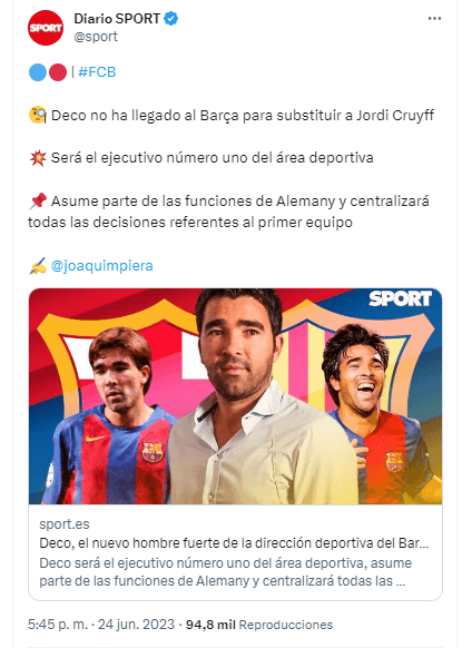 De acuerdo a diario Sport, Deco será el ejecutivo número uno encargado del área deportiva de FC Barcelona. El portugués, qué fue jugador del club y dejó una gran imagen, ahora asumirá parte de las funciones que dejó vacante Alemany y centralizará las decisiones principales en torno al primer equipo.