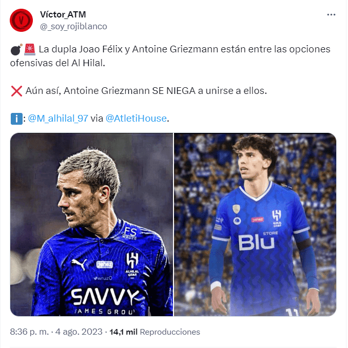 Al-Hilal ya invirtió 178 millones de euros en refuerzos pero no le tiembla la billetera ni el pulso para poder ofertar por Antoine Griezmann. De acuerdo a los medios árabes, el poderoso equipo de medio oriente quiere al delantero francés y también a Joao Félix para armar una temible dupla de ataque para recuperar la corona local.