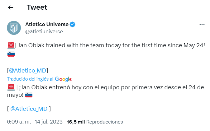 Su arquero titular indiscutido Jan Oblak logró trabajar a la par del grupo, dejando atrás una importante lesión que lo marginó en la parte final de la temporada. De hecho, no trabajaba con el resto de sus compañeros desde el 24 de mayo. Sin dudas, un refuerzo interno que suma el Colchonero para la inminente temporada.