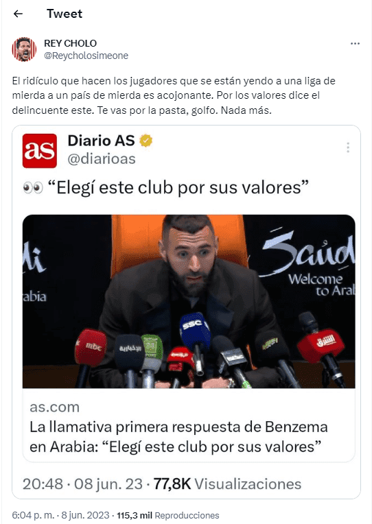 En conferencia de prensa, y ante los medios del mundo entero, Karim Benzema confirmó que eligió el club Al Ittihad por sus valores y estuvo realmente muy lejos de hacer referencia al suculento sueldo económico que va a percibir tras firmar su acuerdo con el conjunto de medio oriente. Frase que no tardó en replicarse.