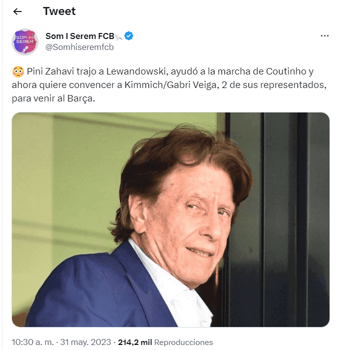 De acuerdo a la información de Som I Serem FCB, fueron ofrecidos a FC Barcelona, Joshua Kimmich y Gabri Veiga. Los dos jugadores son representados por Pini Zahavi, quien tiene gran relación con Joan Laporta y que tiene la intención de ubicarlos en la Ciudad Condal de cara a la próxima temporada.