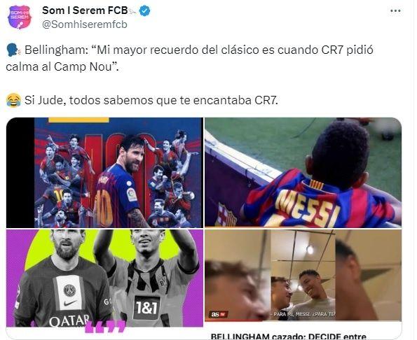 Jude Bellingham ha sido relacionado mucho con FC Barcelona, porque apareció una foto de él en su niñez, puesto la camiseta del equipo y con la 10 de Lionel Messi en la espalda. El inglés también ha mencionado a los hinchas que prefiere al astro argentino, antes que a Cristiano Ronaldo. Claro, esto dijo antes de llegar al Real Madrid.