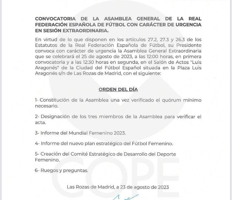 Por otra parte, se ha filtrado el orden del día que tendrá la asamblea del próximo viernes 25 de agosto en la sede de la RFEF, donde Luis Rubiales hará el balance de su gestión y mencionó los importantes avances que el fútbol femenino ha tenido dentro de su presidencia.