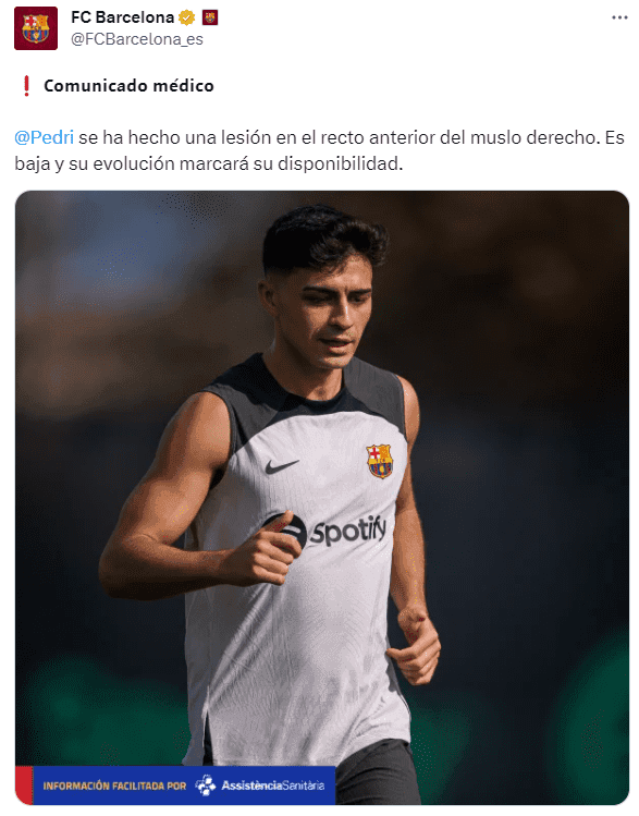 El FC Barcelona acaba de confirmar hace instantes la lesión de su futbolista Pedri, quien sufrió una lesión en el recto anterior del muslo derecho y será baja de acuerdo a su evolución por confirmarse en las próximas horas, lo cual indicaría que se perdería el juego ante el Villarreal este fin de semana.