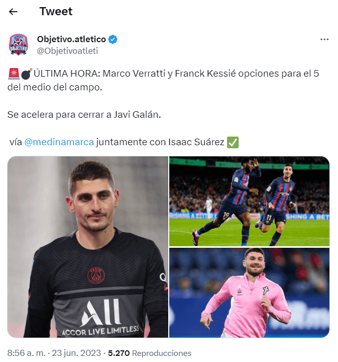 De acuerdo a la información del periodista Medina de diario Marca, Atlético de Madrid va por Marco Verratti, mediocentro de PSG. El volante italiano no ve con malos ojos salir en este mercado de pases luego de un desgaste en el club parisino y en el Colchonero se ilusionan con tenerlo como un refuerzo de extrema jerarquía.