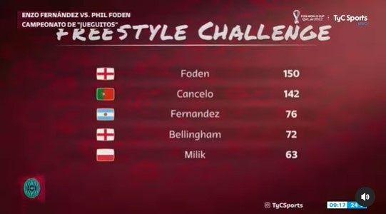 Ahora bien, yendo a la comparación con Bellingham, el jugador surgido en River Plate lo superó en un reto de Qatar 2022. Tanto ellos dos como otros futbolistas compitieron en un juego de freestyle en el que se los sometió a una prueba habilidad de toques. El ganador fue Phil Phoden con 150 puntos, pero Enzo Fernández ocupó el tercer puesto con 76, cuatro más que Jude.