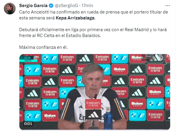 En propia voz del entrenador, Carlo Ancelotti confirmó que el guardameta español Kepa Arrizabalaga será de la partida para el once inicial ante el Celta de Vigo; citando además que hay muy buenas sensaciones en el entrenamiento y que el guardameta está listo para hacer su debut con la camiseta del Real Madrid.