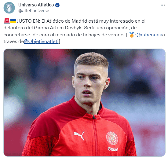 Es por eso que de acuerdo a información reseñada por el periodista Rubén Uría, tanto Cerezo como Gil Marín estudian seriamente hacer un claro ofrecimiento al Girona CF, por los servicios del atacante ucraniano Artem Dovbyk, ficha clave en el armado del once para Michel y que en este momento de la temporada acumula 12 goles en 20 compromisos con el conjunto catalán y actual líder de LaLiga.