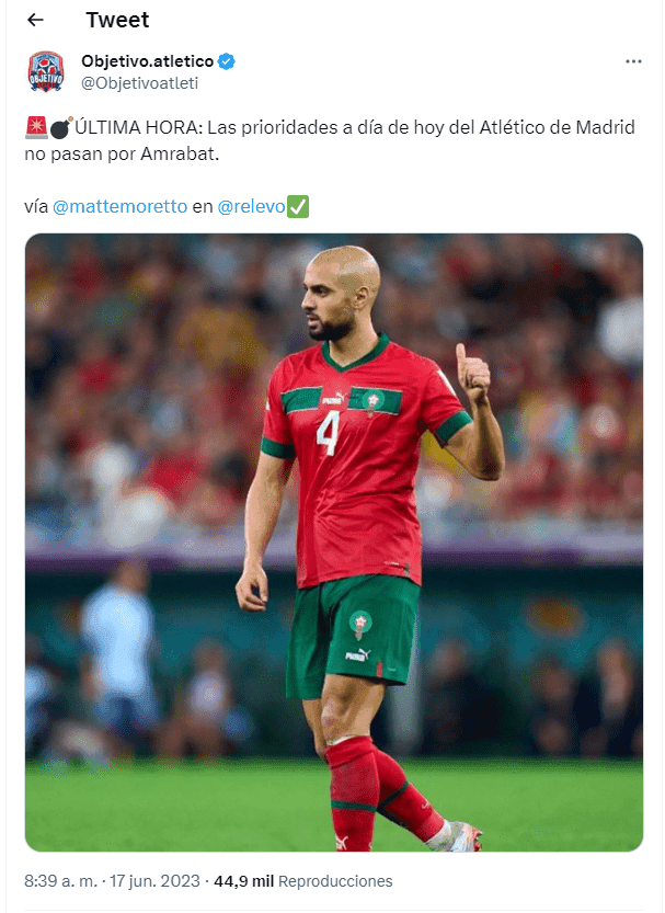 Con la urgencia del mercado y la necesidad de Atlético de Madrid de sumar a un mediocampista, los directivos marcan el pulgar hacia abajo en seguir intentando fichar a Sofyan Amrabat. El jugador sigue especulando con la mejor opción ante las ofertas de FC Barcelona y Bayern Múnich que se suman al interés del Colchonero.