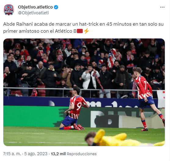 Abde Rahiani es el número 9 del Atlético de Madrid B y en su primer partido amistoso de pretemporada se despachó con un triplete en un solo tiempo. El atacante marroquí ya ha trabajado con el primer equipo y Diego Simeone piensa seriamente darle una oportunidad brindándole minutos durante la próxima temporada.