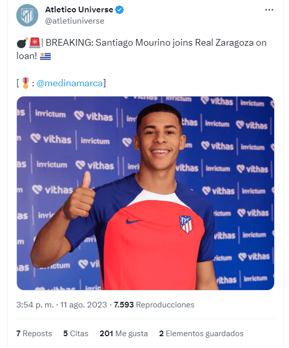 El defensor uruguayo Santiago Mouriño fue uno de los refuerzos para la próxima temporada pero Atlético de Madrid tomó la decisión de prestárselo a Real Zaragoza para que pueda sumar minutos en el fútbol europeo. Es más, el ex jugador de Racing de Uruguay fue la primera cara nueva que confirmó el Colchonero en el mercado de pases pero no logró convencer a Diego Simeone.