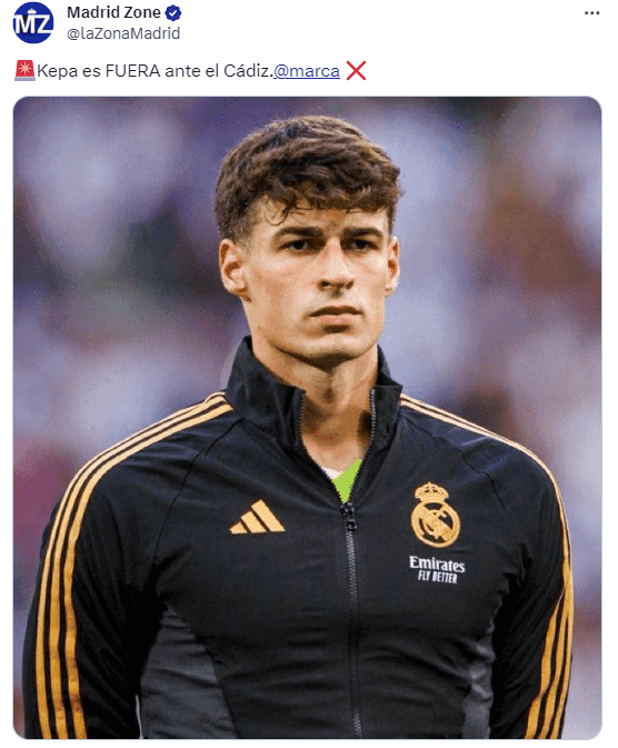 En los últimos instantes, y según indican desde la capital española, se ha confirmado la baja en el cuadro merengue de uno de los elementos más importantes en la temporada, el cual se perderá el próximo compromiso liguero tras el parón. Kepa Arrizabalaga, ha sido baja y solo participó en una parte de la sesión de los entrenamientos, lo cual presume un cambio evidente de cara al duelo siguiente