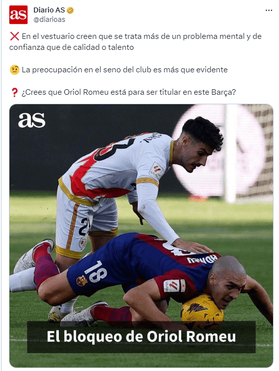 Con la duda sobre el once inicial, muchos otros elementos aparecen para Xavi Hernández, uno de ellos y quizá de los más bajos de la presente temporada es el de Oriol Romeu, el pivote de 32 años que actualmente tiene un valor de 5 millones de euros, de acuerdo a la plataforma especializada en fichajes, Transfermarkt, 17 apariciones y una asistencia en cerca de 885 minutos, son sus datos en la actual campaña, no son quizá el punto más alto de los elegibles por el entrenador.