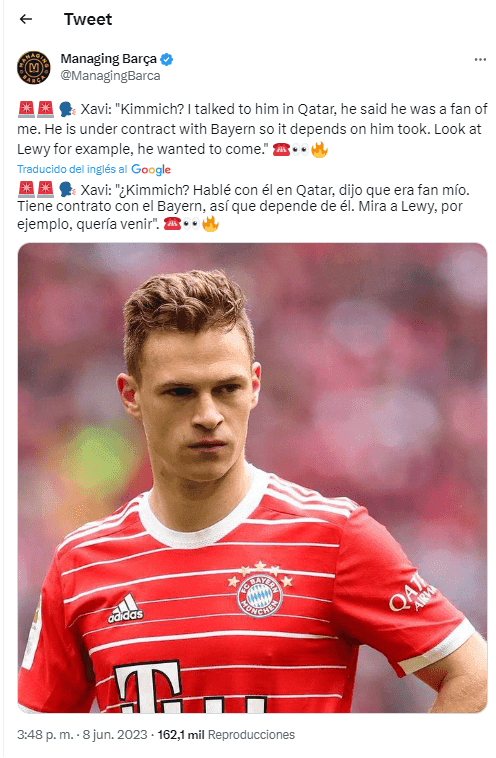 De acuerdo a la información de Managing Barça , Xavi Hernández estuvo con Joshua Kimmich dialogando en la Copa del Mundo de Qatar 2022. Allí, el jugador alemán le confesó que admiraba al ex jugador español aunque el entrenador se encargó de aclarar que la situación depende del esfuerzo que pueda hacer el volante de 28 años.