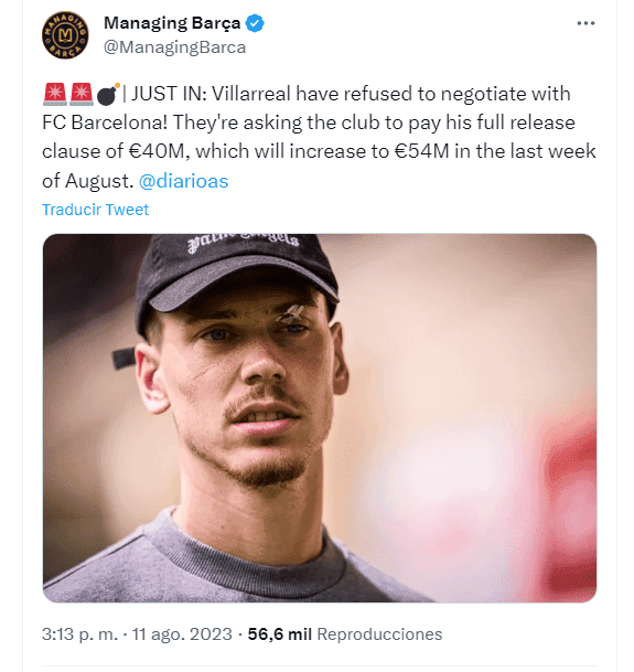 De acuerdo a la información de diario AS, Villarreal FC retrucó la oferta que hizo FC Barcelona y le pide el pago de la cláusula de rescisión completa que es de 40 millones de euros para quedarse con la ficha del defensor del mundo campeón con la selección argentina en Qatar 2022. Algo que parece imposible.
